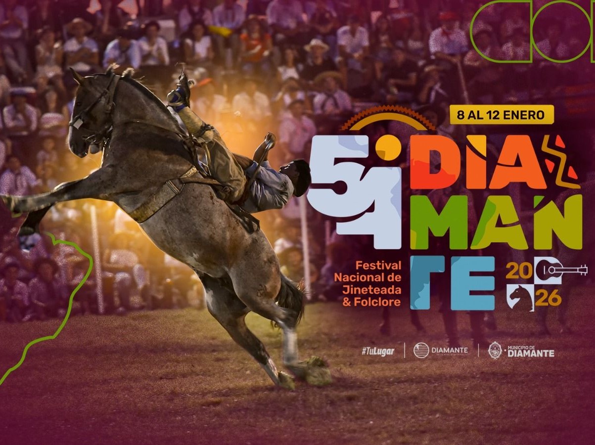 Desde este JUEVES 8 al 12 de enero se desarrollará el 54° Festival Nacional de Jineteada y Folclore de Diamante. Las mejores tropillas y jinetes del país estarán en el emblemático Campo Martín Fierro, junto a una imponente grilla artística que incluye a Abel Pintos, Lázaro Caballero, Sergio Galleguillo, Jorge Rojas y Campedrinos, entre otros músicos de renombre nacional, regional y local. Las entradas y plateas están a la venta.