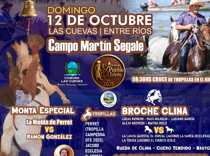 El domingo 12 de octubre de 2025 viviremos una jornada inolvidable para celebrar nuestras raíces isleñas, con todo el color, la fuerza y la emoción de la tradición. Durante el día, habrá desfile de agrupaciones tradicionales, azote de tropillas en el río, una gran jineteada de tropillas y un espectacular broche de oro en clinas y bastos. También se podrá disfrutar de danzas, espectáculos musicales, almuerzo criollo y servicio de cantina.