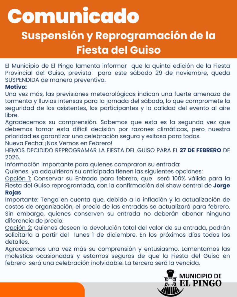 La Municipalidad de El Pingo, Pueblo San Julián, Dpto Paraná de Entre Ríos, emitió un comunicado en la tarde de este MIERCOLES 26 de noviembre anunciando la nueva reprogramación de la fecha de la 5ª FIESTA PROVINCIAL DEL GUISO: